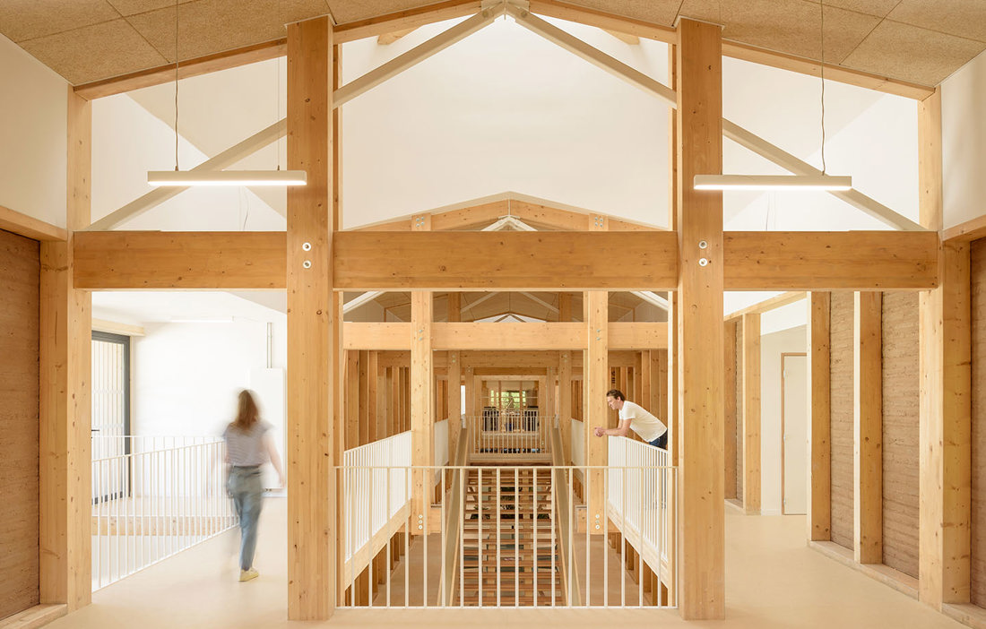 “Zemljane opeke same po sebi nisu dovoljne da zid bude stabilan, pa smo ih kombinovali s drvenim stubovima i gredama. Dizajn je inspirisan tradicionalnim kućama s drvenim kosturom koje već dugo postoje u okolnim regijama, gdje se između drvene konstrukcije nalazi zemlja. Radi stabilnosti, drveni okvir je izveden u dvije etaže, svaka visine tri metra. Hibridna konstrukcija izrađena u potpunosti od prirodnih materijala ima brojne prednosti”, objašnjava Benoît Sindt.