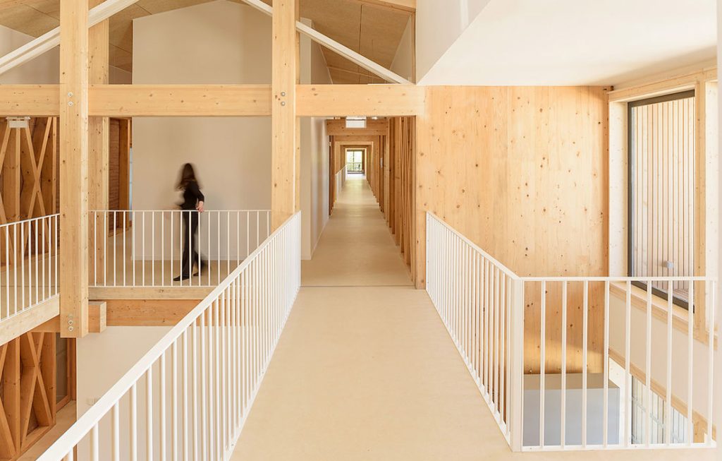 Vidljiva drvena konstrukcija u enterijeru, koja je ostavljena neobrađena i prostoru daje topao osjećaj, izrađena je od smrče iz susjednih planina Vosges. Osim toga, u zidovima je korištena zemlja iz same regije.